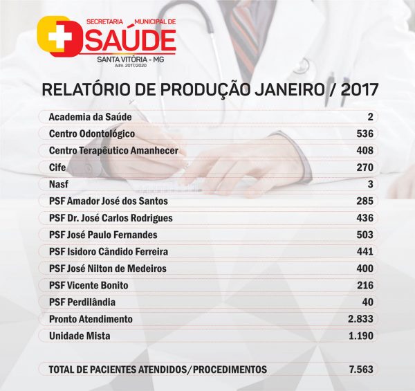 A Secretaria Municipal de Saúde divulgou nessa semana o relatório das atividades desenvolvidas no mês de janeiro, primeiro mês da Administração Municipal 2017/2020.