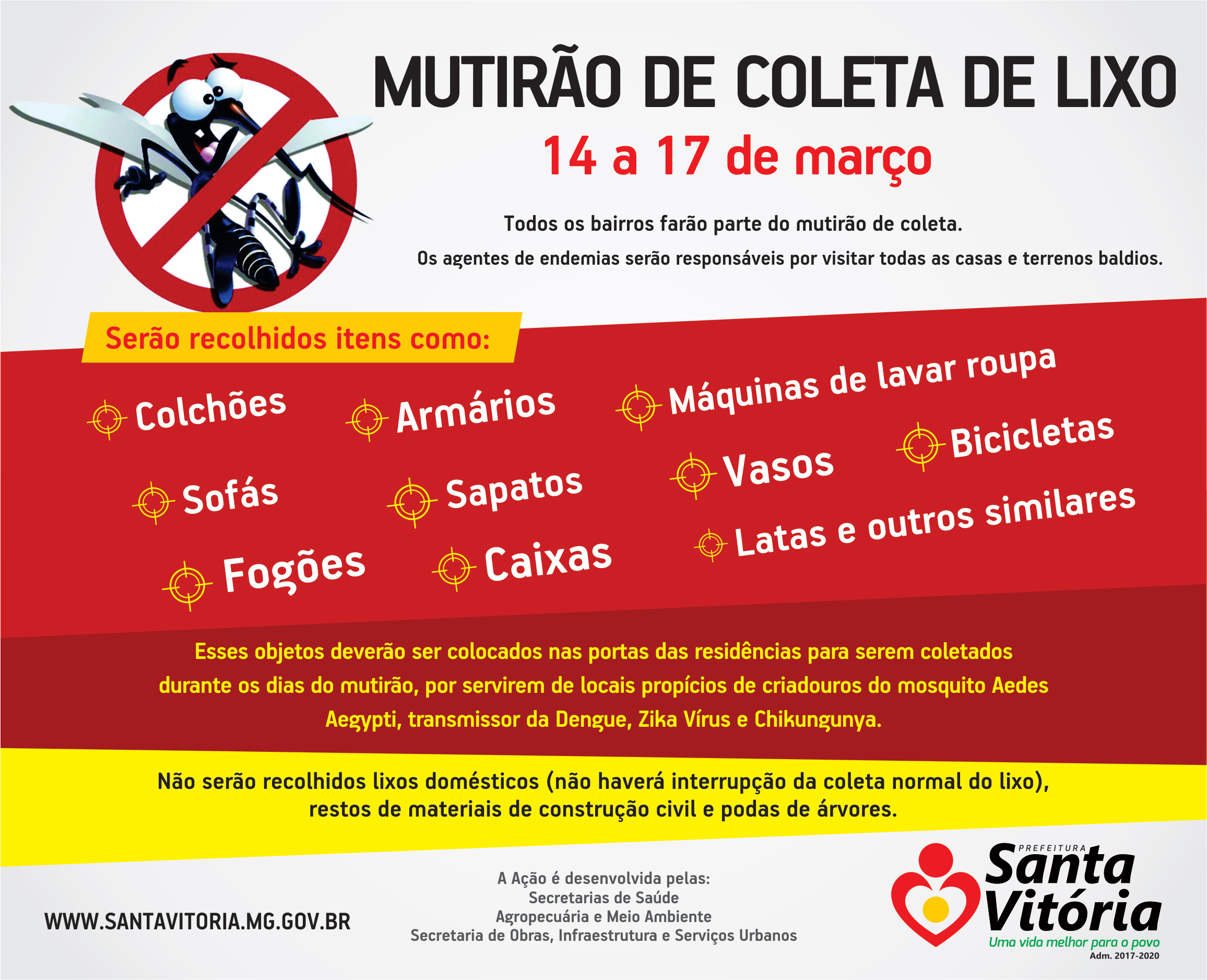 A Prefeitura de Santa Vitória realizará nos próximos dias 14 a 17, terça a sexta, um Mutirão de Coleta de Lixo. O trabalho compõe o Plano de Ações de combate ao mosquito da Dengue desenvolvido pelo Município.
