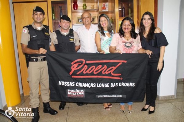 O Prefeito Salim Curi, as Secretárias Municipais de Educação Vânia Silva e de Desenvolvimento Social, Mariza Curi, a secretária-adjunta, Fabiana Almeida, 2º Tenente Marcos Guimarães de Oliveira, Comandante do 54º Batalhão da Policia Militar e o Instrutor do Proerd, Cabo Deyvisson Ferreira Martins participaram, no gabinete do Prefeito do lançamento do PROERD/2018 – Programa Educacional de Resistência às Drogas e a Violência desenvolvido pela Polícia Militar com o apoio da Prefeitura Municipal.