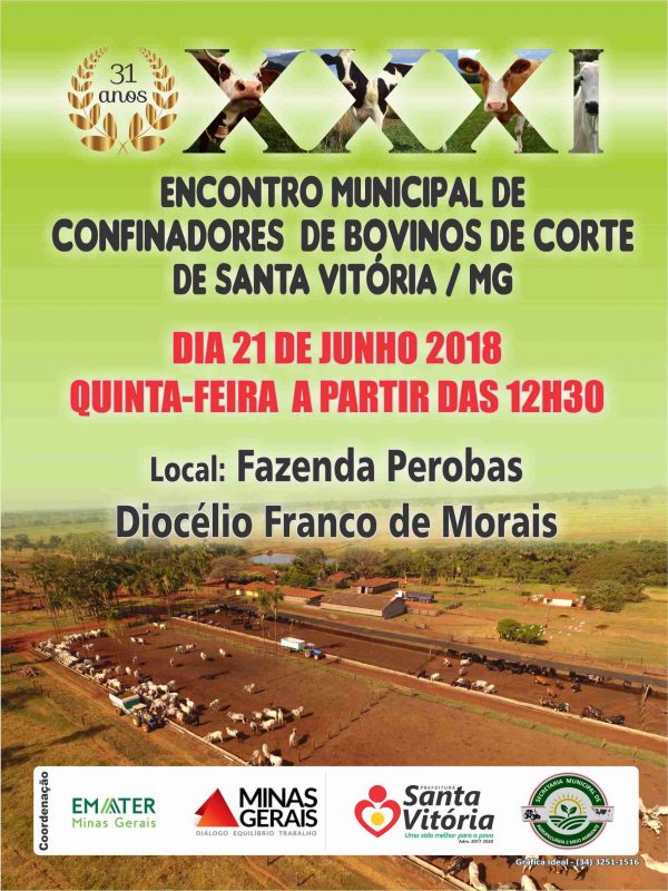 Com o objetivo de debater e ampliar as perspectivas sobre tecnologias para o fortalecimento da bovinocultura de corte, o Governo Municipal, por meio da Secretaria Municipal de Agropecuária e Meio Ambiente, da Secretaria de Estado de Agricultura, Pecuária e Abastecimento e a Emater-MG, promoverá o XXXI Encontro Municipal de Confinadores de Bovinos de Corte.