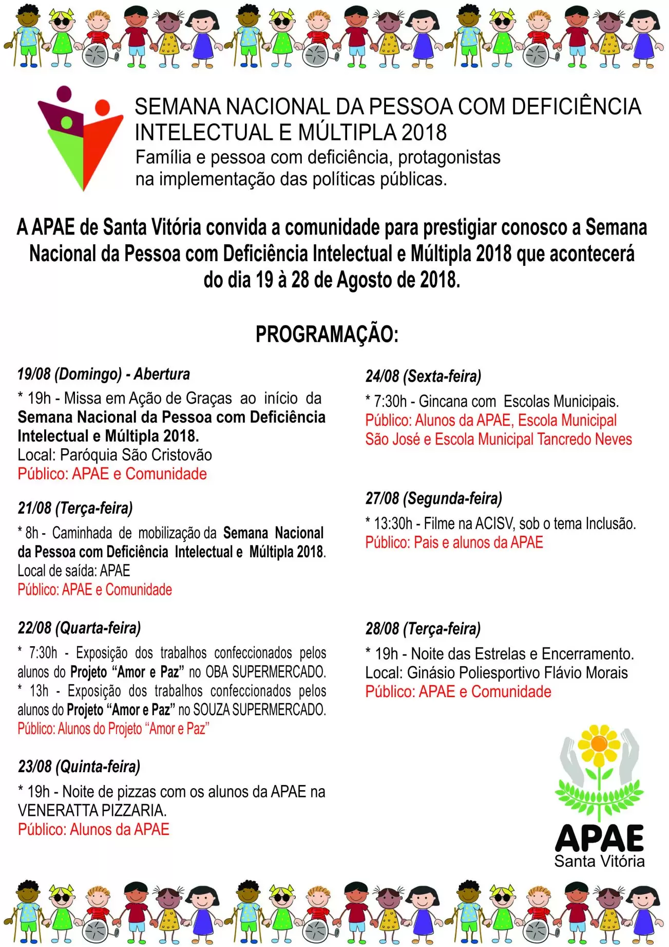 Começa domingo, dia 19 as comemorações da Semana Nacional da Pessoa com Deficiência Intelectual e Múltipla 2018 realizada pela Associação dos Pais e Amigos dos Excepcionais – APAE de Santa Vitória.
