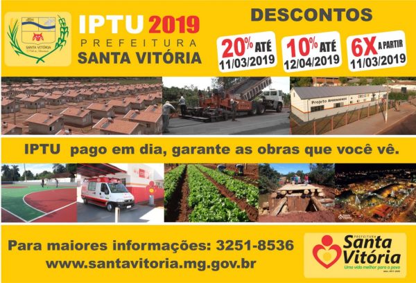 A Prefeitura Municipal de Santa Vitória, através do Departamento de Rendas e Fiscalização, comunica que já estão sendo emitidas as guias para o pagamento do IPTU (Imposto Predial e Territorial Urbano) 2019.