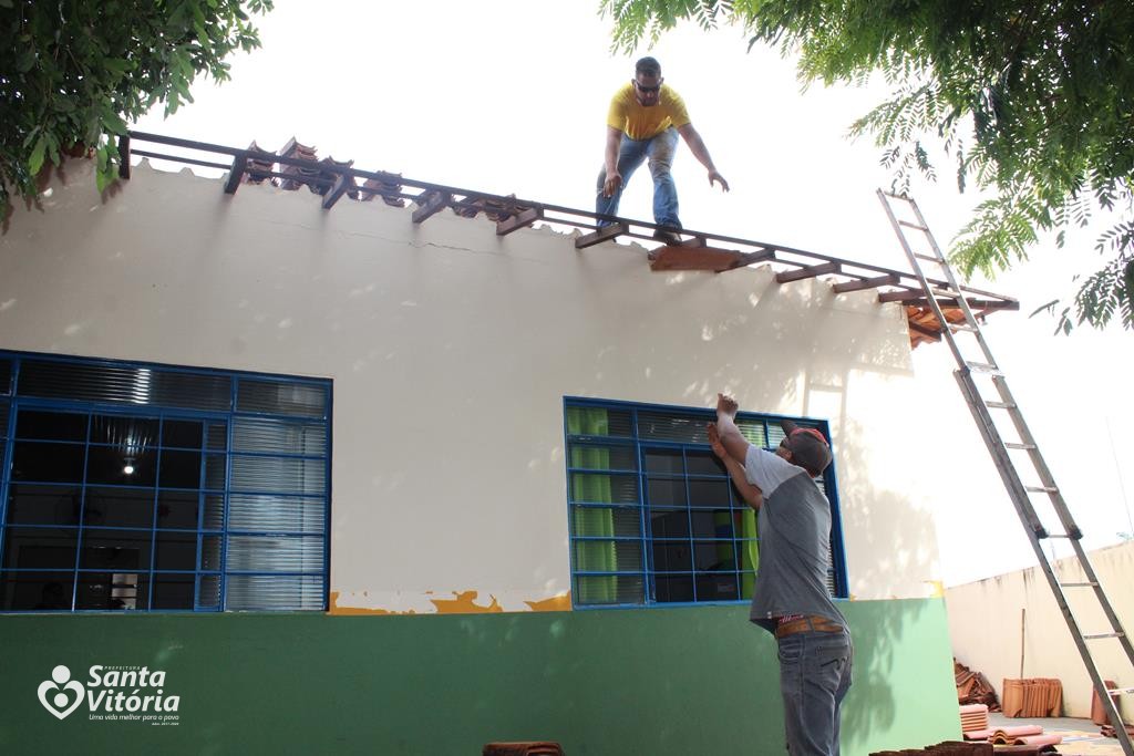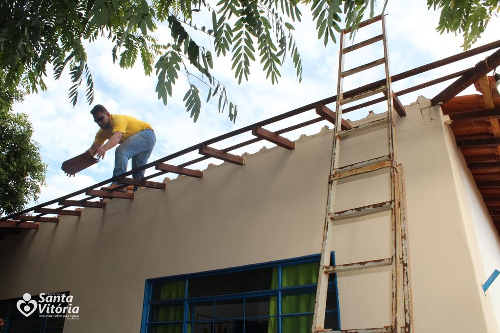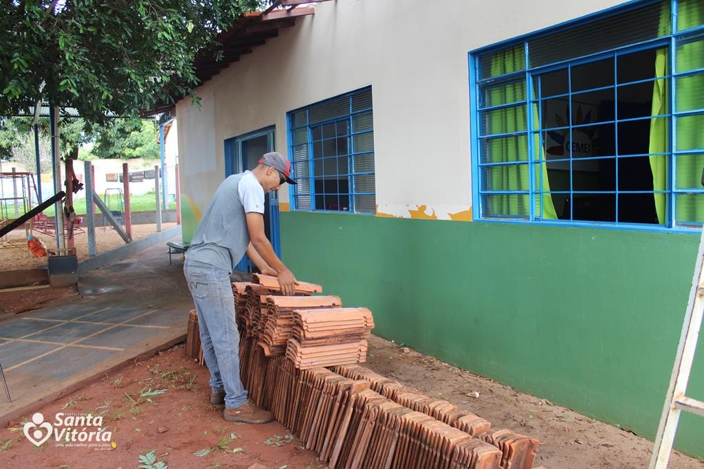 Buscando ofertar um ambiente agradável e adequado para os funcionários e alunos do CEMEI Alcione Siqueira Faria Rodrigues, no BDA, a Prefeitura de Santa Vitória, através da Secretaria Municipal de Obras e Serviços Urbanos está realizando o conserto do telhado, além da pintura da fachada.