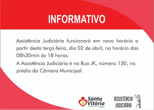 O novo horário de funcionamento da Assistência Judiciária entrará em vigor a partir desta terça-feira, dia 02 de abril.