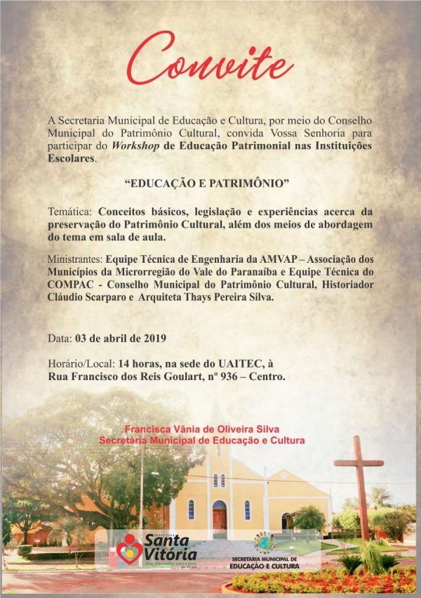 A Secretaria Municipal de Educação e Cultura e parceiros promovem Workshop de Educação Patrimonial, por meio do Conselho Municipal do Patrimônio Cultural.