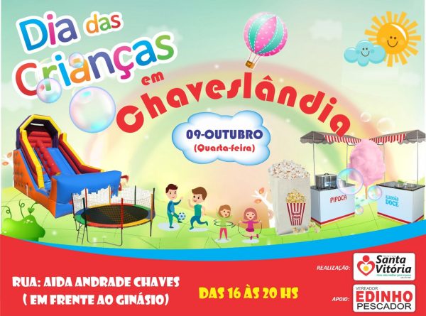 A Prefeitura de Santa Vitória, através da Secretaria de Desenvolvimento Social e Assessoria Distrital com apoio do vereador Edinho Pescador promoverá ações em comemoração ao Dia das Crianças no distrito de Chaveslândia.