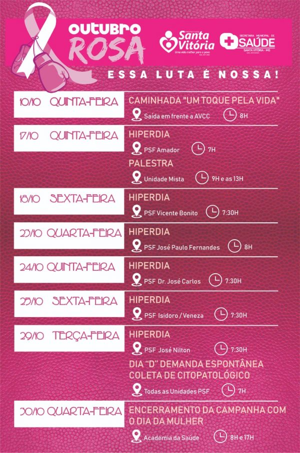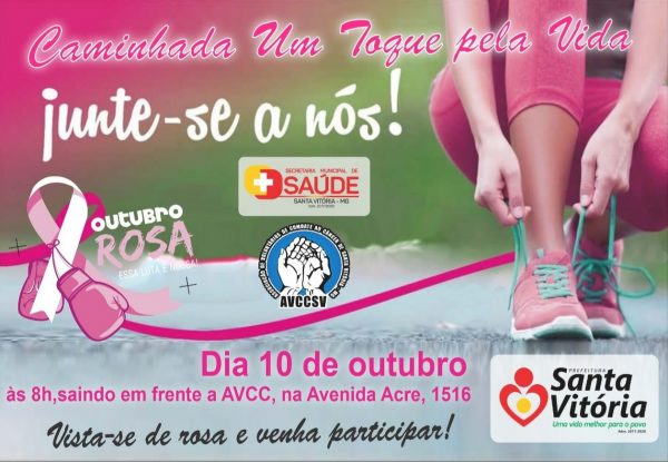 A Prefeitura Santa Vitória, através da Secretaria Municipal de Saúde com o apoio da AVCC convida toda a população para uma caminhada – “Um toque pela vida” – em prol da campanha Outubro Rosa, mês de conscientização da prevenção e Combate ao câncer de mama.