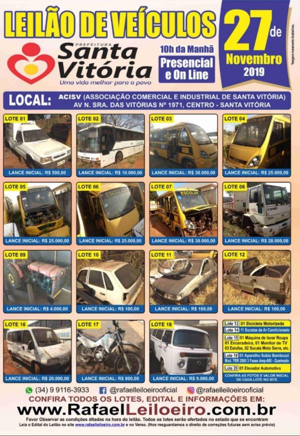 A Prefeitura de Santa Vitória vai realizar no próximo dia 27 de novembro, quarta-feira, às 10 horas da manhã, na ACISV, leilão de veículos inservíveis para venda, na modalidade maior lance.