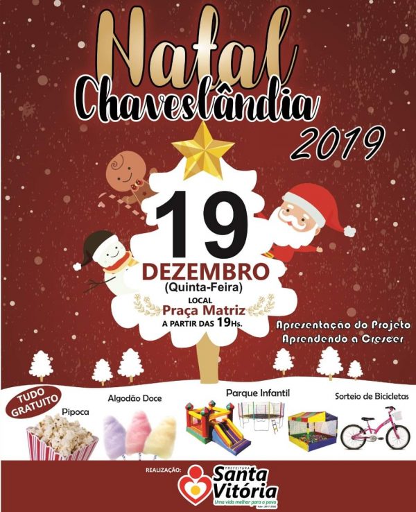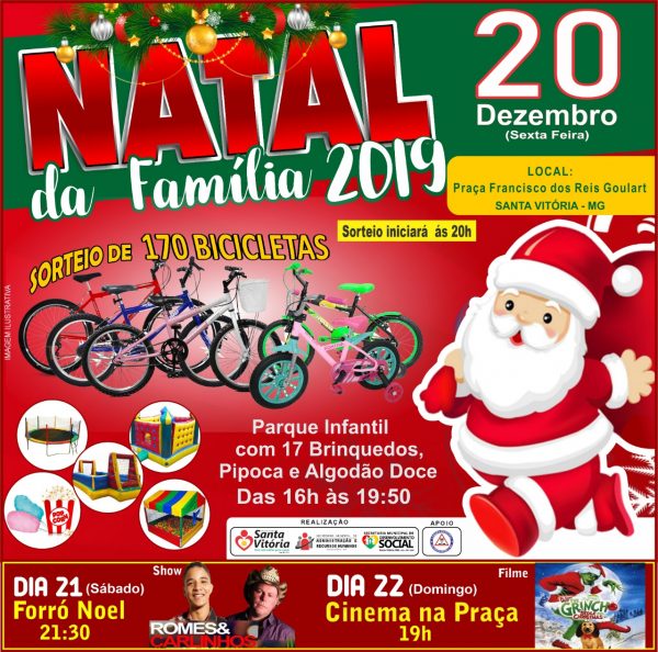 De sexta (20) até domingo (22), a Praça Francisco dos Reis dos Reis Goulart será palco de três eventos natalinos organizados pela Prefeitura de Santa Vitória, através das secretarias municipais de Administração e de Desenvolvimento Social.