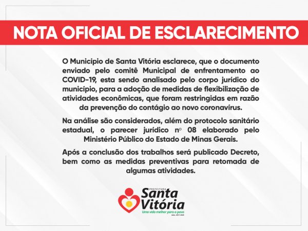 O Município de Santa Vitória esclarece, que o documento enviado pelo comitê Municipal de enfrentamento ao COVID-19, esta sendo analisado pelo corpo jurídico do município, para a adoção de medidas de flexibilização de atividades econômicas, que foram restringidas em razão da prevenção do contágio ao novo coronavírus.