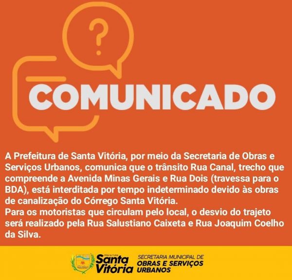 A Prefeitura de Santa Vitória, por meio da Secretaria de Obras e Serviços Urbanos, comunica que o trânsito Rua Canal, trecho que compreende a Avenida Minas Gerais e Rua Dois (travessa para o BDA), está interditada por tempo indeterminado devido às obras de canalização do Córrego Santa Vitória. Para os motoristas que circulam pelo local,…