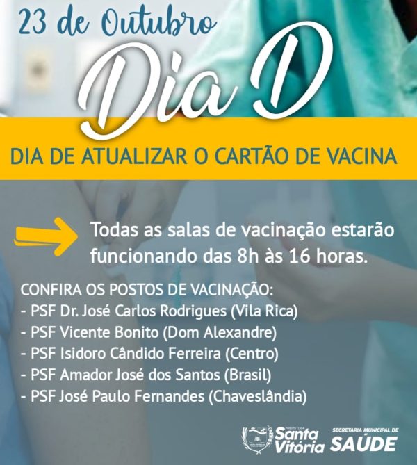 A Prefeitura de Santa Vitória, através da Secretaria Municipal de Saúde, realiza neste sábado (23) o Dia D da Campanha de Multivacinação, que tem como objetivo colocar em dia a caderneta de vacinação, independentemente da idade.