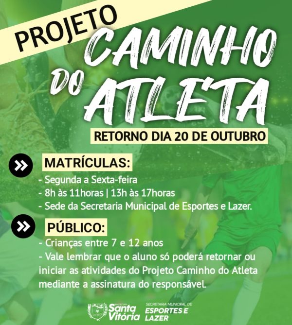 De acordo com informações da Secretaria Municipal de Esportes e Lazer, o Projeto Caminho do Atleta terá início nesta quarta-feira (20) em Santa Vitória, seguindo todas as normas de medidas sanitárias do Decreto Municipal e do protocolo Minas Consciente de enfrentamento à pandemia de Covid-19. As matrículas estão abertas para crianças entre sete e 12…