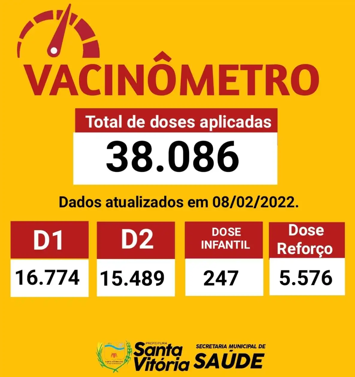 De acordo com a coordenadora de Epidemiologia, Anahi Abdala Teixeira Silva, até o momento foram aplicadas 38.086 doses. Os dados estão no vacinômetro atualizado pelo Departamento de Epidemiologia da Secretaria Municipal de Saúde da Prefeitura de Santa Vitória e divulgado através da Secretaria Municipal de Governo/Comunicação Social.