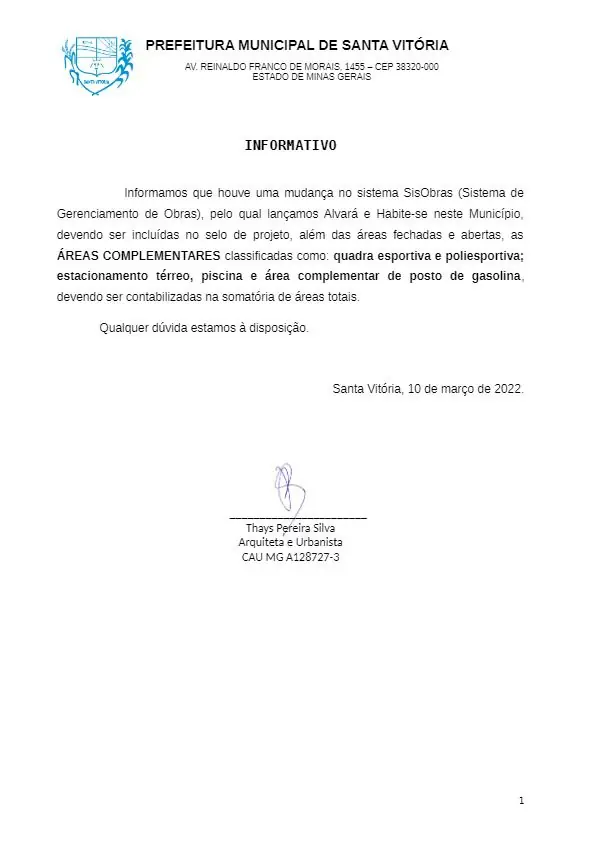 Está em vigor, conforme informativo anexo a mudança no Sistema de Gerenciamento de Obras. De acordo com a Arquiteta Thays Pereira Silva áreas complementares deverão ser incluídas no selo de projeto e notações técnicas, submetido ao Cadastro Físico e Imobiliário da Prefeitura de Santa Vitória.