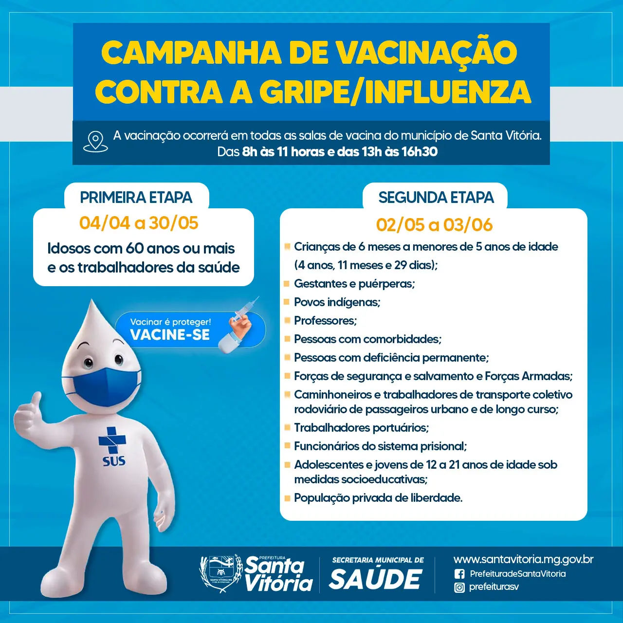 A Prefeitura de Santa Vitória, através da Secretaria Municipal de Saúde realizará a 24ª edição da Campanha de Vacinação contra a Gripe/Influenza, que ocorrerá entre os dias 4 de abril a 3 de junho.