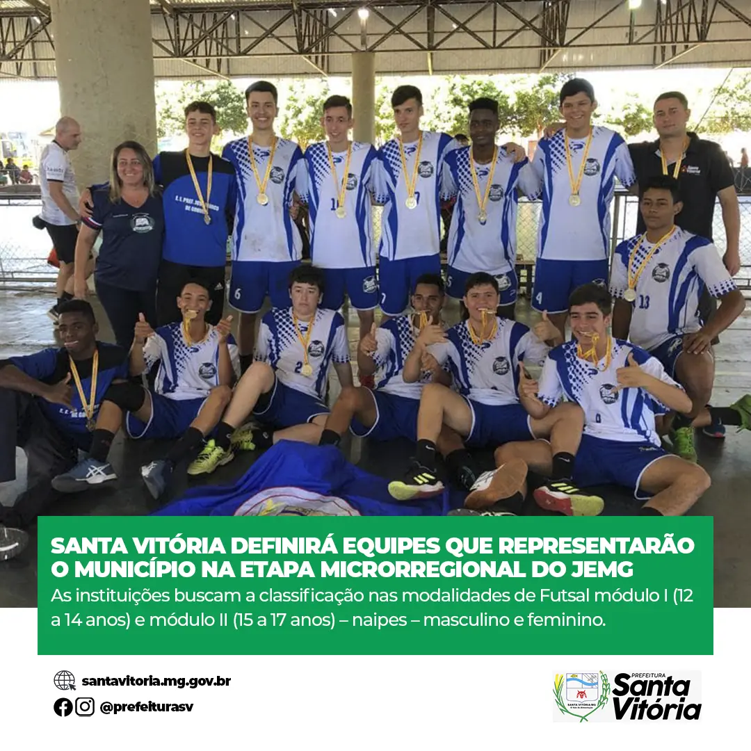 Nos dias 07, 08, e 09 de Abril acontecerá à realização da Etapa Municipal dos jogos Escolares de Minas Gerais – JEMG 2022. Esta etapa definirá as equipes e as respectivas escolas municipais e estaduais que representarão a cidade de Santa Vitória na fase microrregional dos Jogos Escolares de Minas Gerais – JEMG 2022, no mês de Maio, na cidade de Centralina.