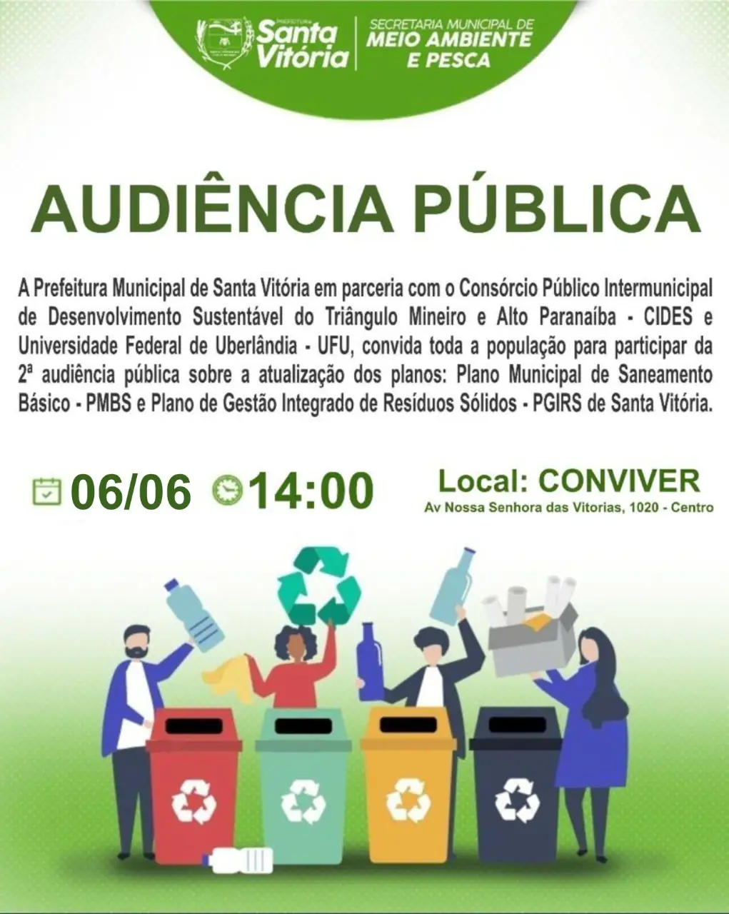 A Prefeitura Municipal de Santa Vitória convida a toda a população para participar da 2ª Audiência Pública online sobre a atualização dos planos: Plano Municipal de Saneamento Básico – PMBS e Plano de Gestão Integrado de Resíduos Sólidos – PGIRS do município de Santa Vitória.