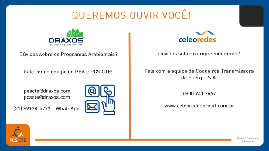 A equipe de educadoras, a Draxos e a Coqueiros Transmissora de Energia agradece a receptividade da população de Chaveslândia, e espera que o encontro tenha sido produtivo e esclarecedor para o público presente. Caso a população tenha alguma dúvida sobre o empreendimento ou o programa, entre em contato com os canais abaixo: