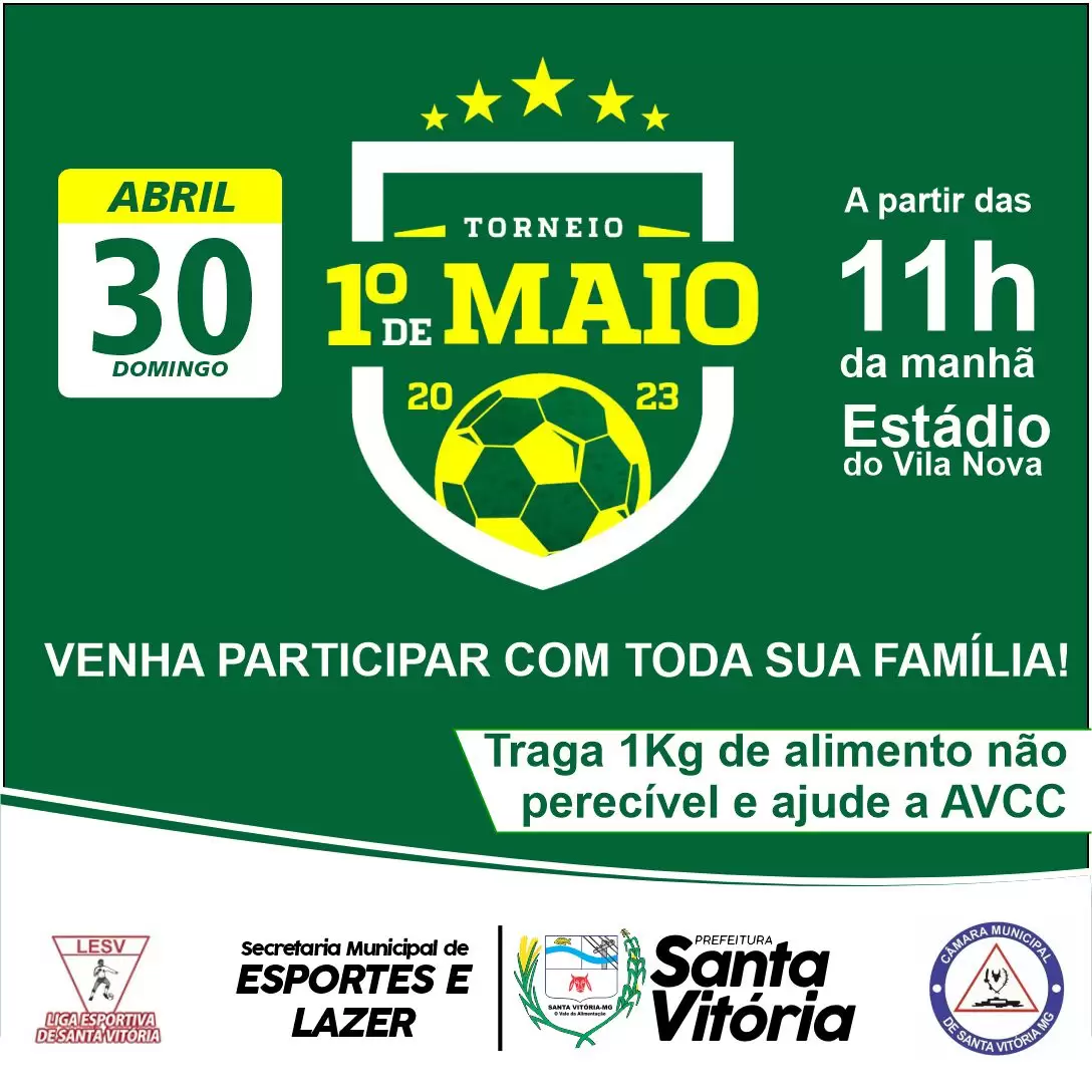 O tradicional Torneio 1º de Maio em homenagem ao trabalhador será realizado em Santa Vitória neste domingo, dia 30 de abril, a partir das 11 horas da manhã no Estádio José Franco de Gouveia, do Vila Nova Futebol Clube. Antecedendo o torneio haverá, às 10 horas da manhã, um jogo das equipes sub 13 da escolinha de futebol.
