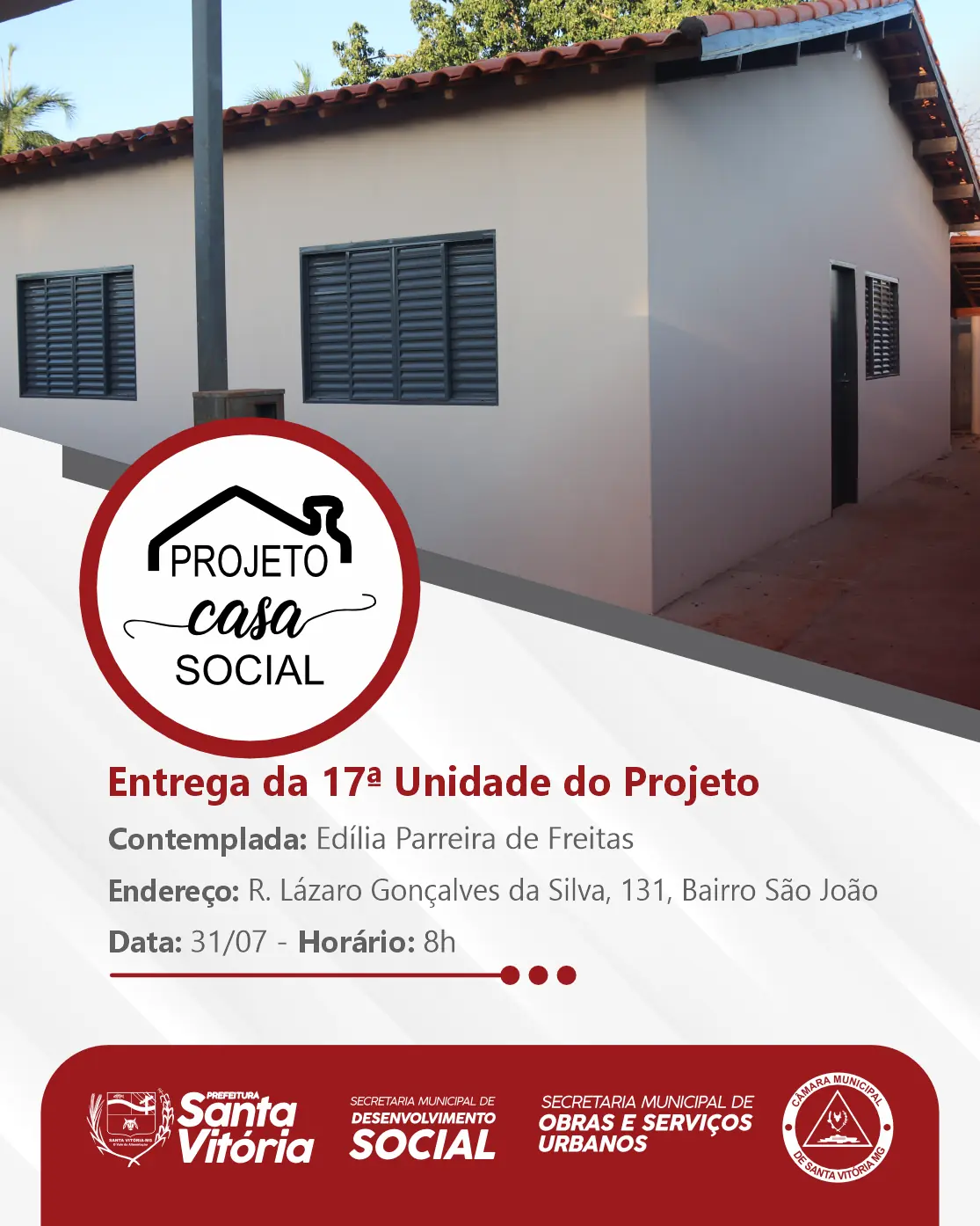 A prefeitura de Santa Vitória, por meio da secretaria Municipal de Desenvolvimento Social, através do Setor de Habitação, entregará a décima sétima unidade do Projeto Casa Social na próxima segunda-feira, dia 31 de julho.