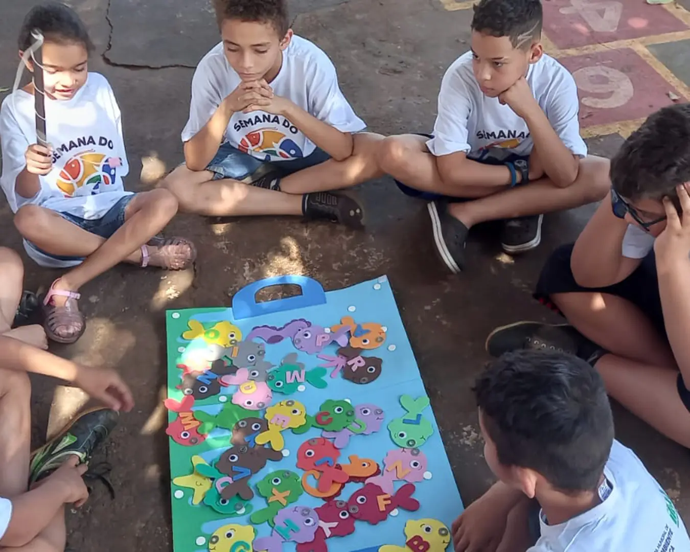 Entre as atividades propostas aconteceu uma visita à um pesque e pague com degustação de peixe frito e também as crianças desenvolveram um trabalho de colagem de escamas.