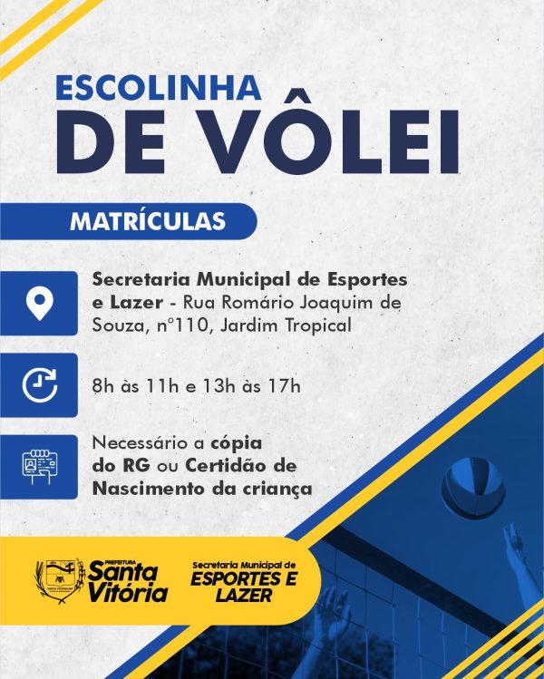 A prefeitura de Santa Vitória, por meio da secretaria de Esportes e Lazer informa a toda população que está com as matriculas abertas para a escolinha de vôlei. Os interessados devem procurar a secretaria de Esportes para fazer sua inscrição. Fique atento.