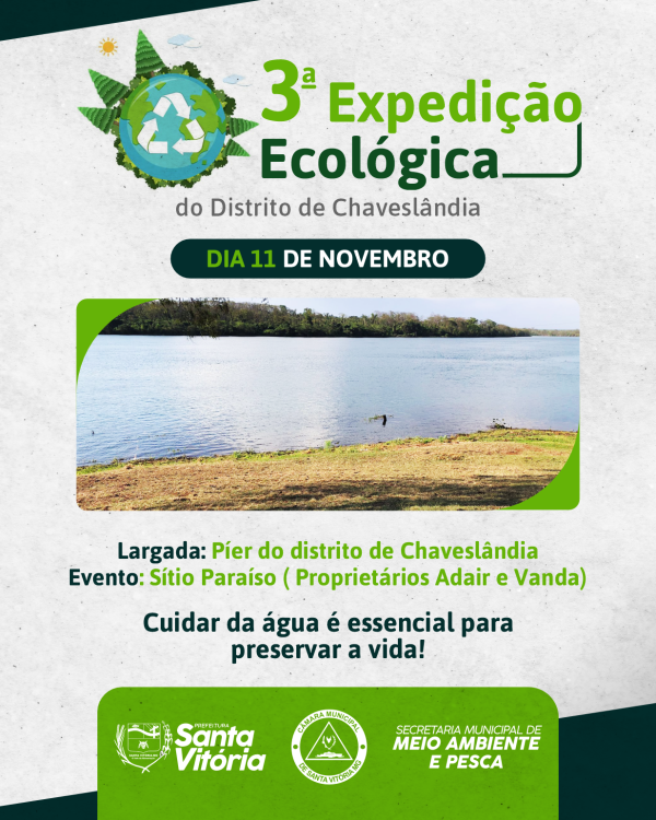 A prefeitura de Santa Vitória, por meio da secretaria de Meio Ambiente e Pesca, vai realizar a 3ª Expedição Ecológica do Distrito de Chaveslândia, um evento voltado a preservação ambiental, no dia 11 de novembro.A partir de hoje, dia 16, já podem ser feita as inscrições para a participação na expedição, de forma gratuita, na…