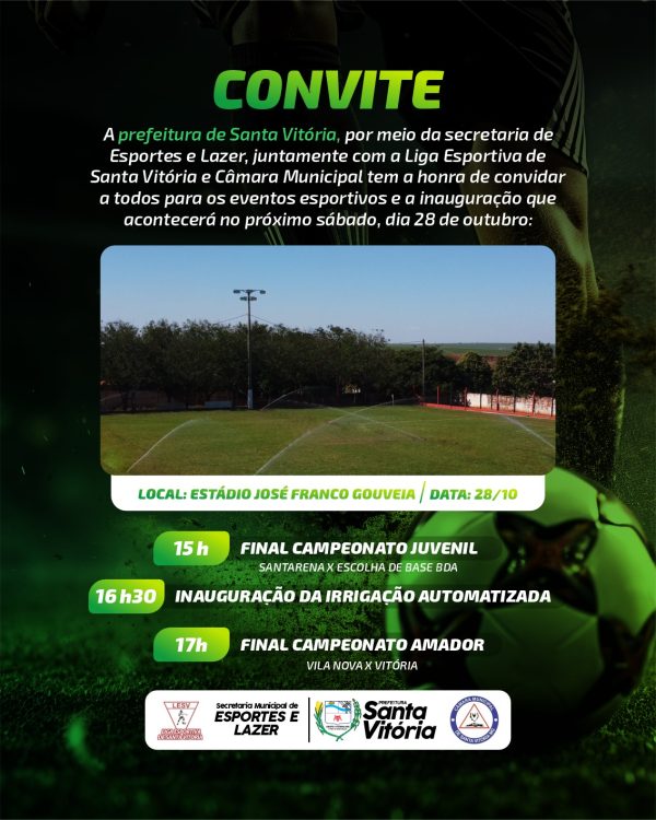 A prefeitura de Santa Vitória, por meio da secretaria de Esportes e Lazer, juntamente com a Liga Esportiva de Santa Vitória, vai entregar a irrigação automatizada do Estádio José Franco de Gouveia durante os eventos esportivos no próximo sábado, dia 28.Com duas finais marcadas para a data a inauguração será entre uma partida e outra.…