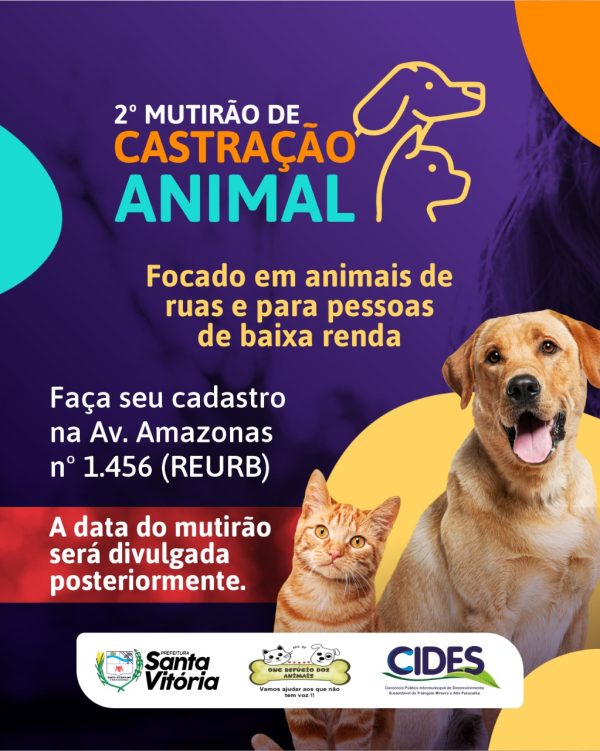 O Município de Santa Vitória em parceria com a ONG Refúgio dos Animais, o Consórcio Público Intermunicipal de Desenvolvimento Sustentável do Alto Paranaíba – CIDES e a ONG Ajuda – Aliança Juizforana Pela Defesa dos Animais realizarão, em parceria, o segundo mutirão de castração de animais, com foco no atendimento de animais que vivem nas…