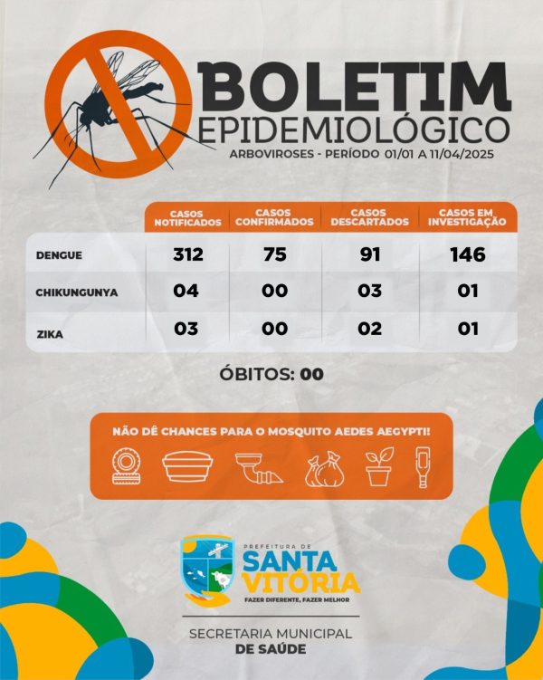 Atenção, população de Santa Vitória!A Secretaria Municipal de Saúde divulga o Boletim Epidemiológico de Arboviroses com dados do período de 01/01 a 11/04/2025. Fique por dentro da situação e ajude no combate ao mosquito Aedes aegypti! A prevenção começa em casa!Elimine água parada e proteja sua família!