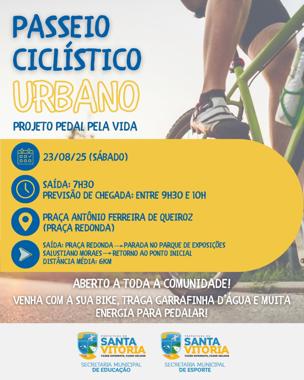 A Prefeitura de Santa Vitória, por meio da Secretaria Municipal de Esportes, realizou o Passeio Ciclístico Urbano – Projeto Pedal pela Vida, ação voltada ao incentivo da prática esportiva, à promoção da saúde e à mobilização da população por meio do ciclismo.