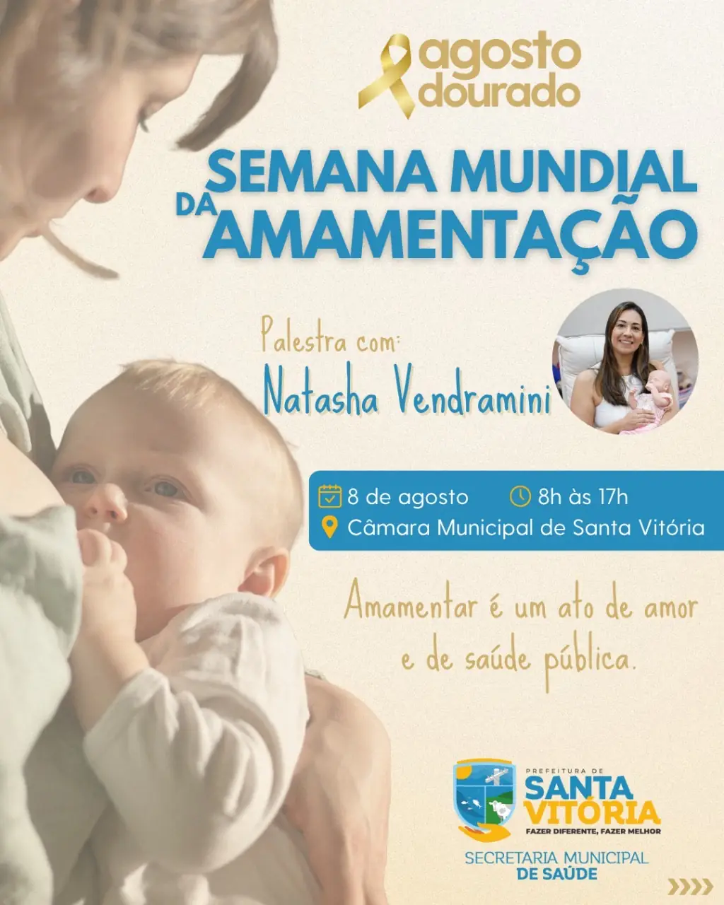 Em comemoração ao Agosto Dourado, mês dedicado à conscientização sobre a importância do aleitamento materno, Santa Vitória terá a honra de receber uma convidada especial: Natasha Vendramini, enfermeira especialista em cuidado materno-infantil, consultora internacional certificada IBCLC e referência em amamentação em Uberlândia-MG.