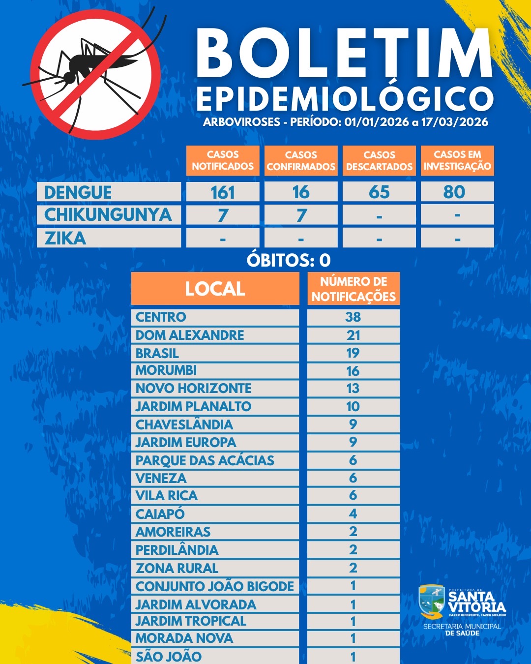 A Prefeitura de Santa Vitória, por meio da Secretaria Municipal de Saúde, divulga o boletim atualizado com os dados de arboviroses (dengue, zika e chikungunya) no período de 01/01/2026 a 17/03/2026.