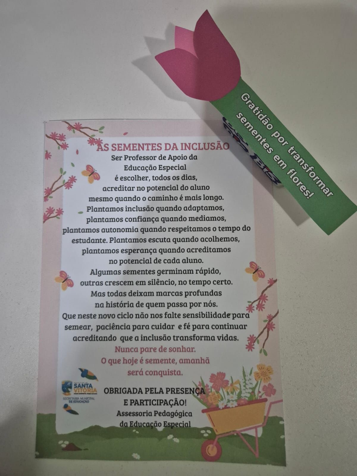 O momento contou com a presença da Secretária Municipal de Educação, professora Luiza, que reforçou a importância do compromisso, da responsabilidade e da sensibilidade no trabalho desenvolvido pelos professores de apoio, destacando que a inclusão é uma construção coletiva e permanente.