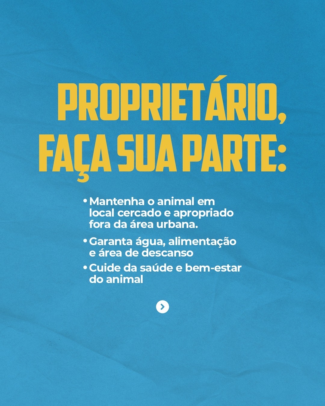 A administração municipal reforça que a responsabilidade pela guarda e cuidado dos animais é, principalmente, dos proprietários, que devem adotar medidas para evitar que eles circulem livremente pelas ruas e rodovias.