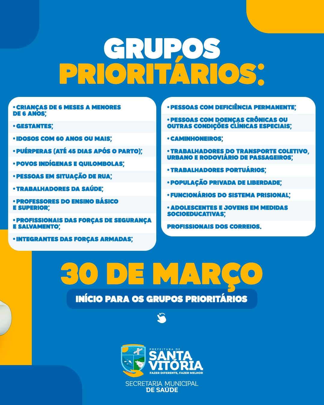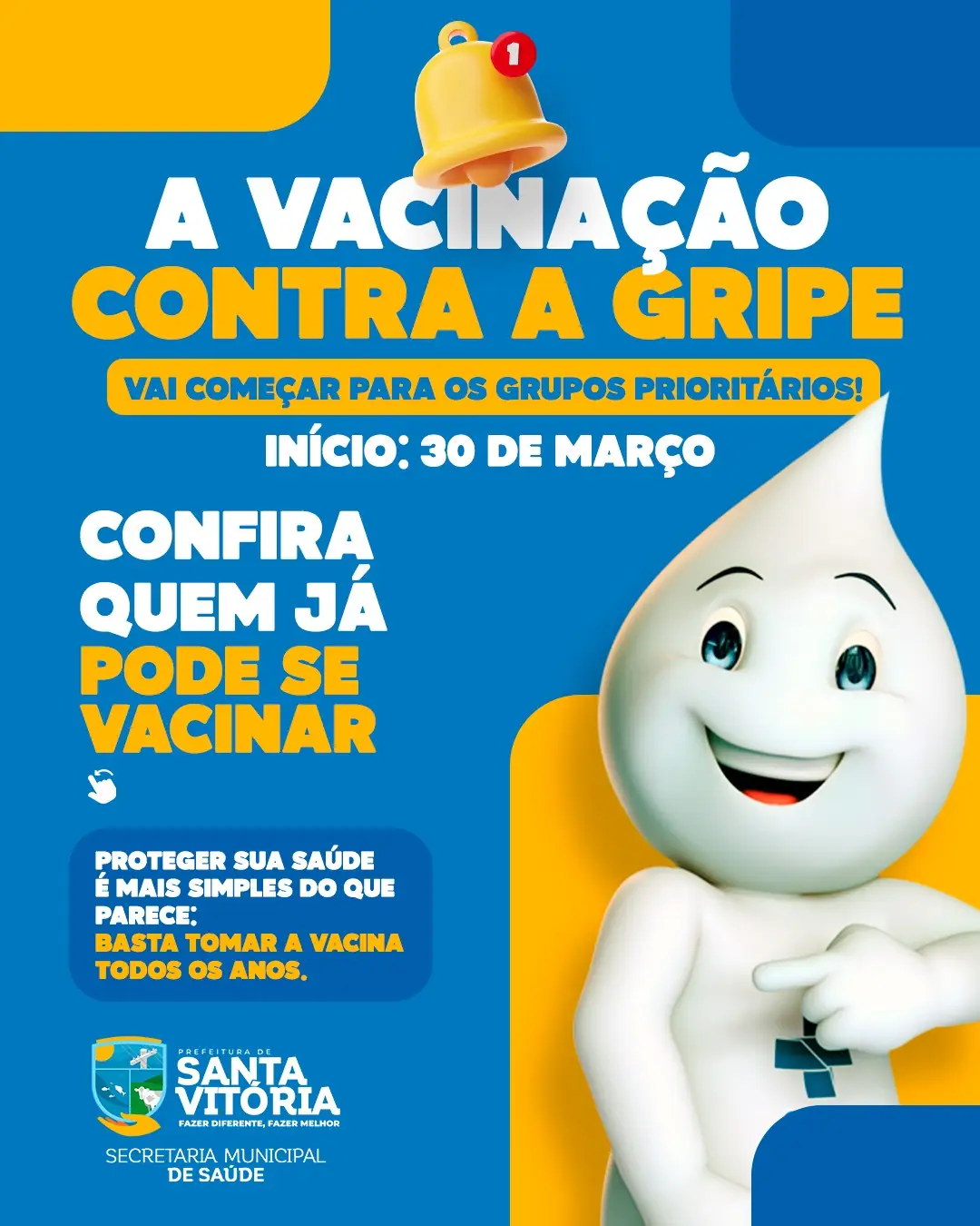 A Prefeitura de Santa Vitória, por meio da Secretaria Municipal de Saúde, inicia no dia 30 de março a campanha de vacinação contra a gripe (influenza), voltada aos grupos prioritários.