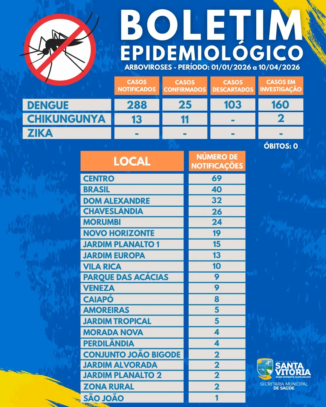 A Prefeitura de Santa Vitória, por meio da Secretaria Municipal de Saúde, divulga o boletim atualizado com os dados de arboviroses (dengue, zika e chikungunya) no período de 01/01/2026 a 10/04/2026.