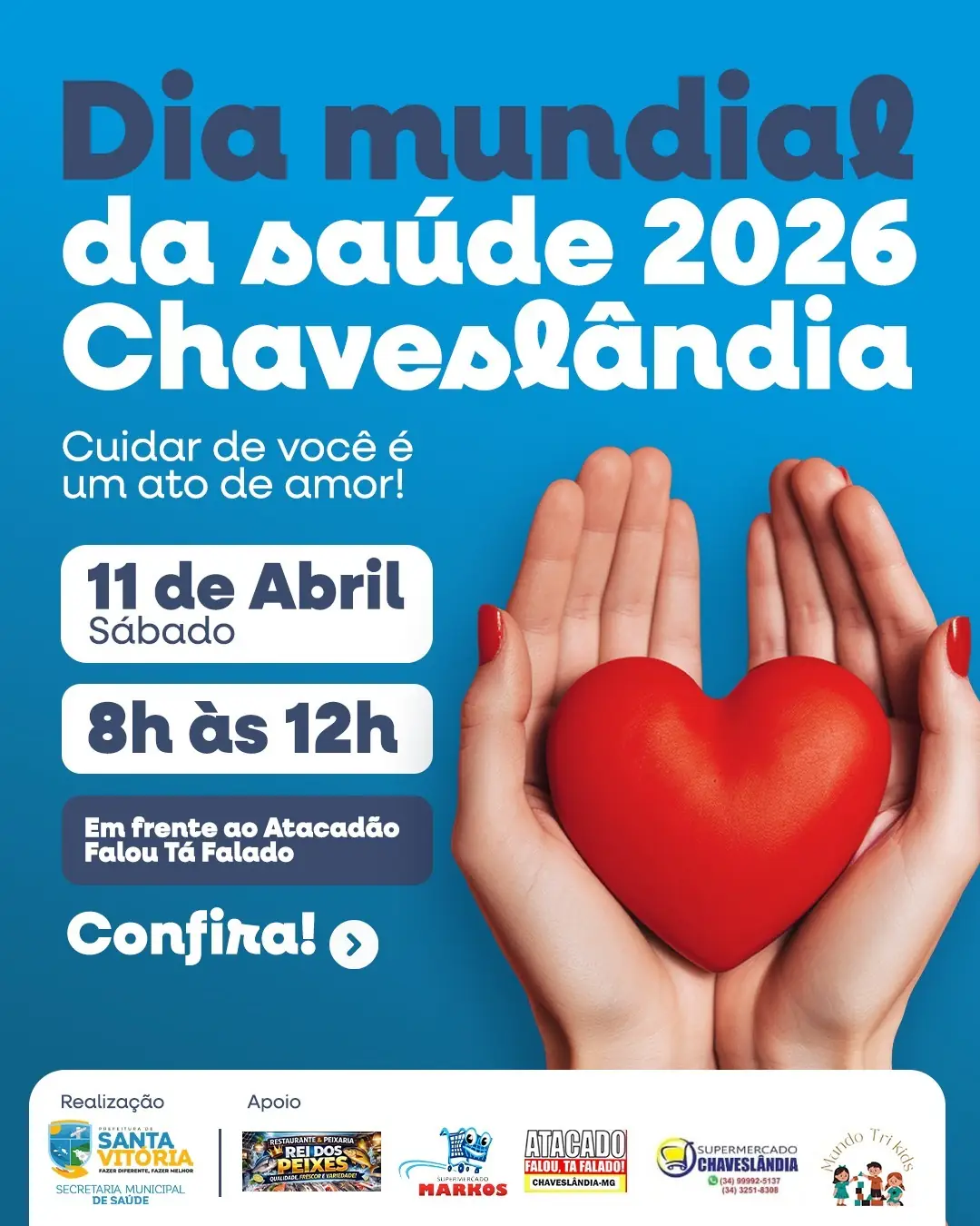 A Prefeitura de Santa Vitória realizará, no próximo dia 11 de abril, uma ação especial em alusão ao Dia Mundial da Saúde, levando diversos serviços gratuitos para a população de Chaveslândia.