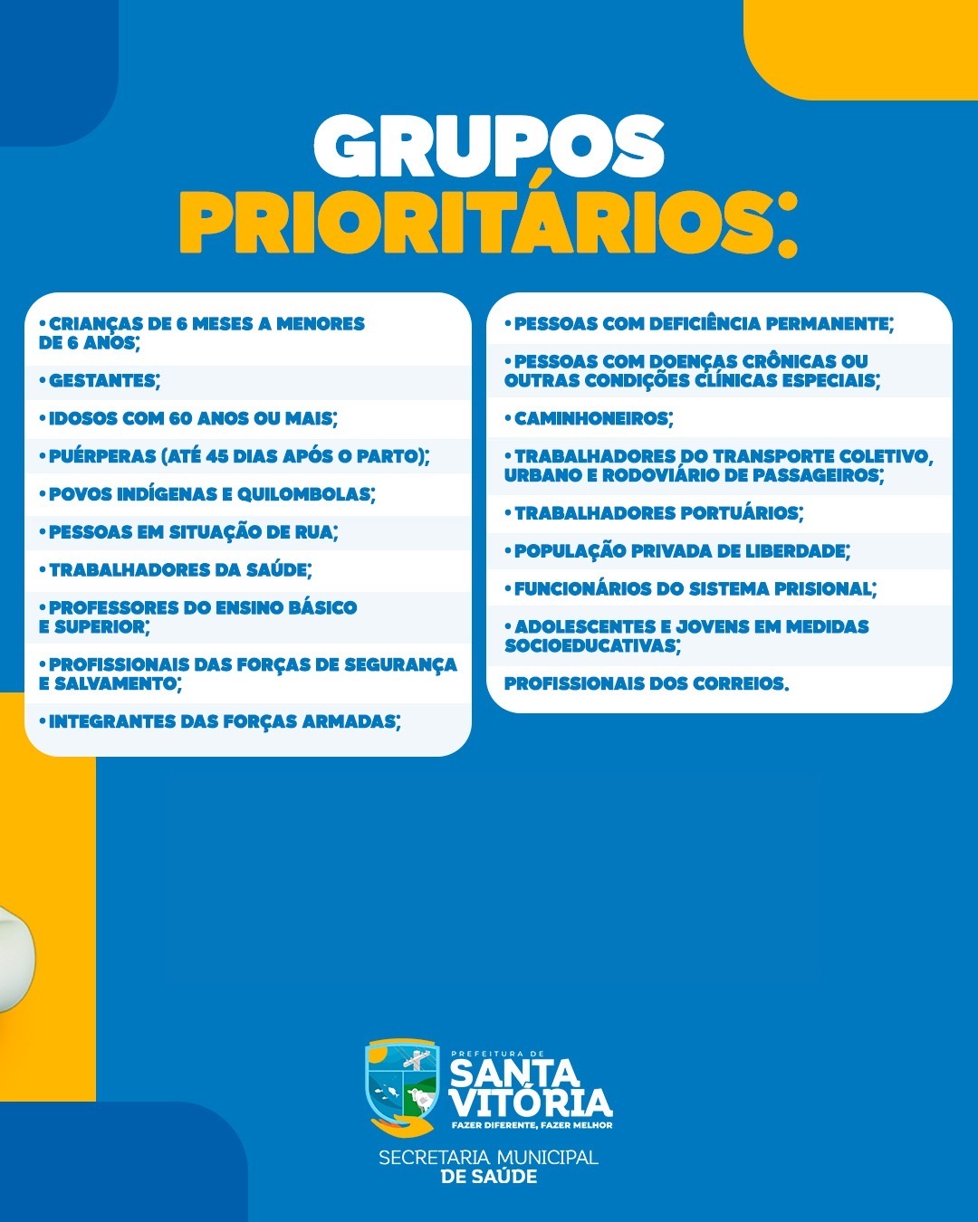 A Prefeitura de Santa Vitória reforça o convite para que as pessoas dos grupos prioritários procurem o ponto de vacinação mais próximo e participem do Dia D. Manter a vacinação em dia é um gesto de cuidado com a própria saúde e também com toda a comunidade.
