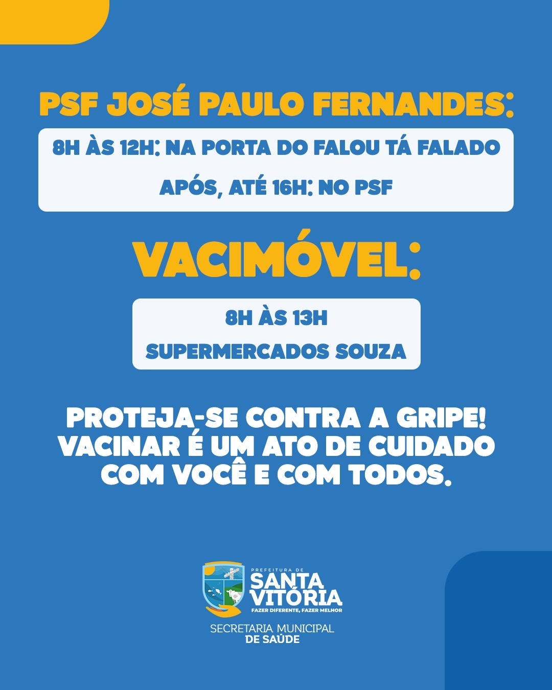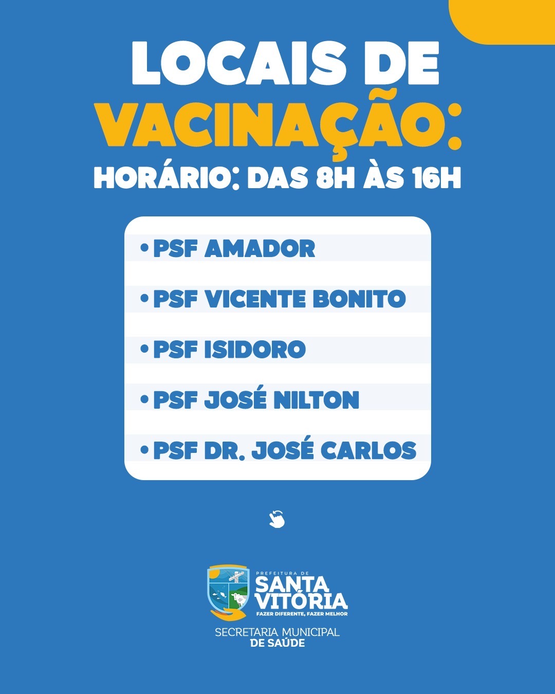 Em Santa Vitória, o atendimento acontecerá das 8h às 16h nas salas de vacina dos PSFs Amador, Vicente Bonito, Isidoro, José Nilton e Dr. José Carlos. O Vacimóveltambém estará atendendo a população das 8h às 13h, em frente ao Supermercado Souza, facilitando o acesso à imunização em um ponto estratégico da cidade.
