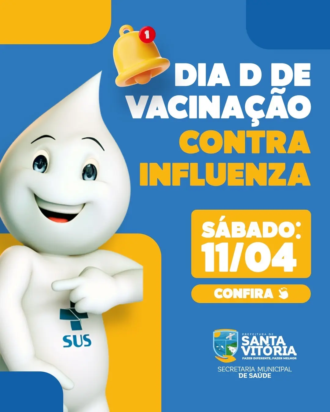 A Prefeitura de Santa Vitória, por meio da Secretaria Municipal de Saúde, promoverá neste sábado, dia 11 de abril de 2026, o Dia D de vacinação contra a influenza (gripe). A mobilização acontecerá em diversos pontos do município e também no distrito de Chaveslândia, com o objetivo de ampliar a cobertura vacinal dos grupos prioritários e reforçar a importância da prevenção.