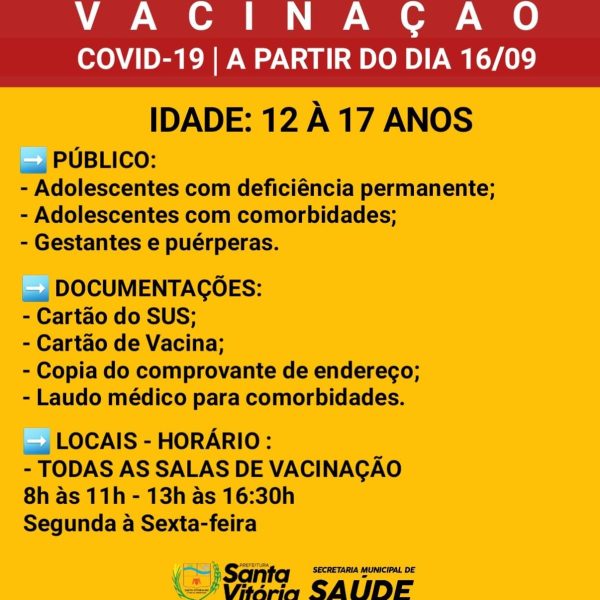 set152021 Santa Vitória começa a vacinar contra a Covid-19 adolescentes com comorbidades e que fazem parte dos grupos prioritários Saúde15/09/2021