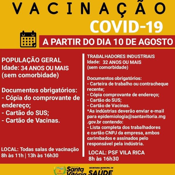 ago92021 População em geral com 34 anos ou mais poderá se vacinar contra Covid-19 a partir desta terça-feira (10) Saúde09/08/2021