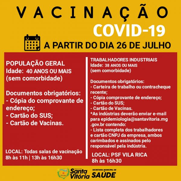 jul232021 Saúde inicia vacinação contra Covid-19 na população geral de 40 anos ou mais e trabalhadores industriais de 38 anos ou mais a partir de segunda-feira 26 Saúde23/07/2021