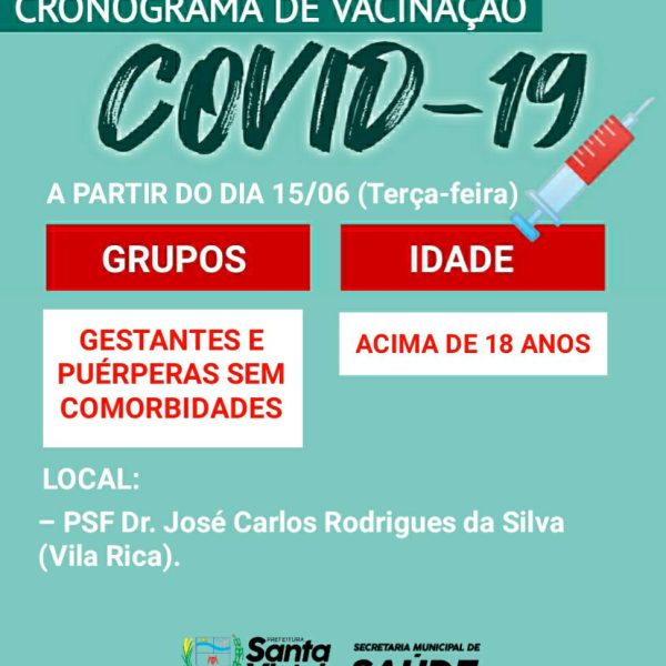 jun152021 Secretaria de Saúde inicia vacinação contra Covid-19, em GESTANTES E PUÉRPERAS SEM COMORBIDADES maiores de 18 anos Saúde15/06/2021