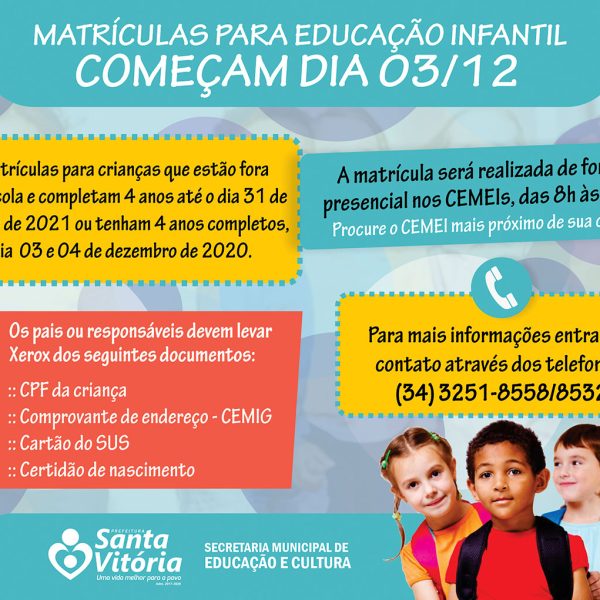 nov182020 Estão abertas as inscrições para o cadastramento escolar para o ano letivo 2021 Educação18/11/2020