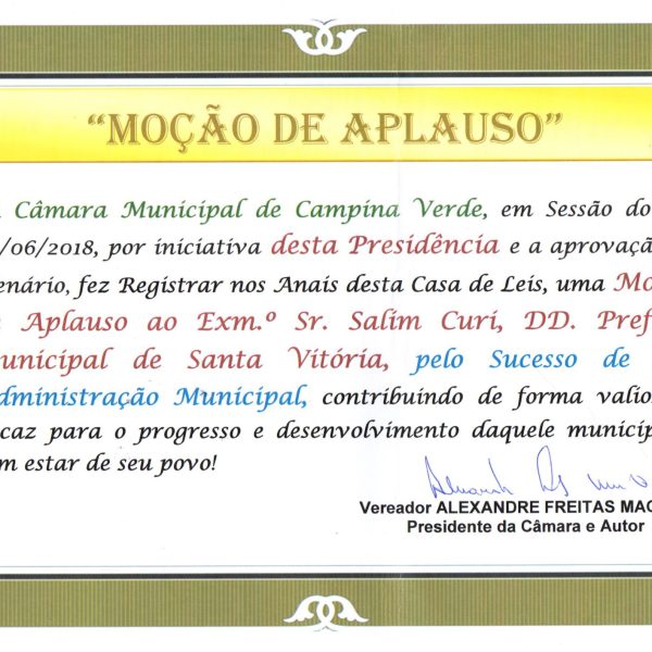 jun202018 Prefeito Salim Curi recebe Moção de Aplauso na Câmara Municipal de Campina Verde Outras20/06/2018