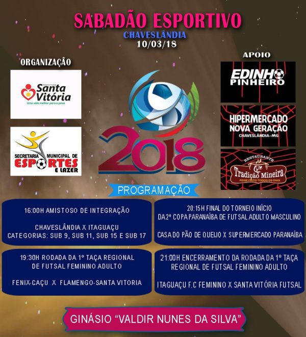 A Prefeitura de Santa Vitória, por meio da Secretaria Municipal de Esportes e Lazer, divulgou a programação completa do Sabadão Esportivo 2018, que será realizado neste sábado (10 de março), a partir das 16h no Ginásio “Valdir Nunes da Silva”.