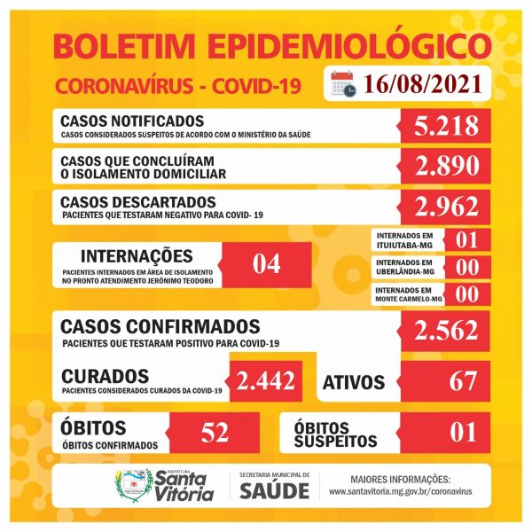 Confira o BOLETIM EPIDEMIOLÓGICO de segunda-feira, dia 16